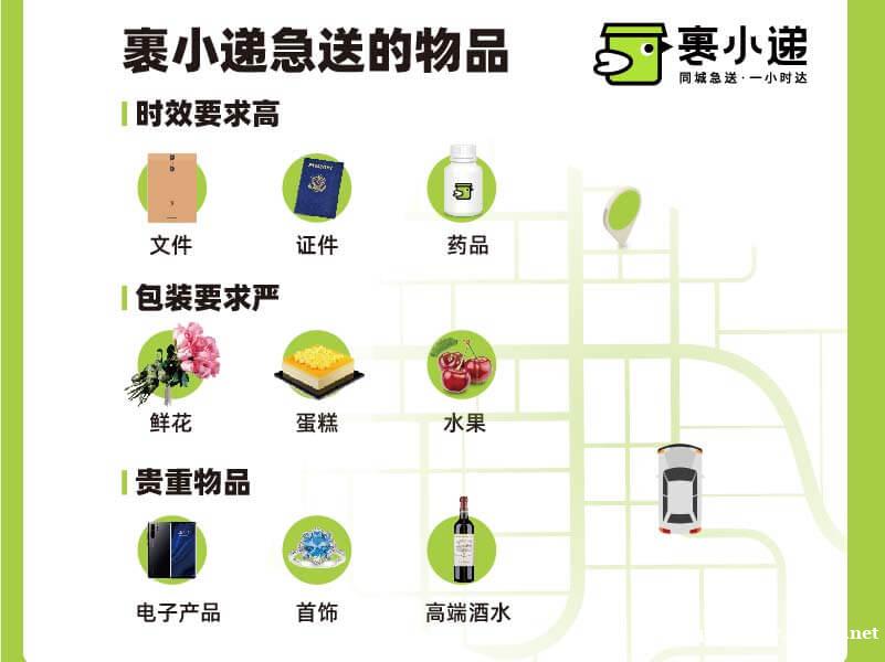 裹小递递送物品类型有:外卖、文件、证件、样品、血样、鲜花、蛋糕、珠宝、贵重物等各种“时效,安全,美观”要求高的物品。可为企业、工厂、餐饮、快消、医疗、互联网等多行业定制企业物流急送服务